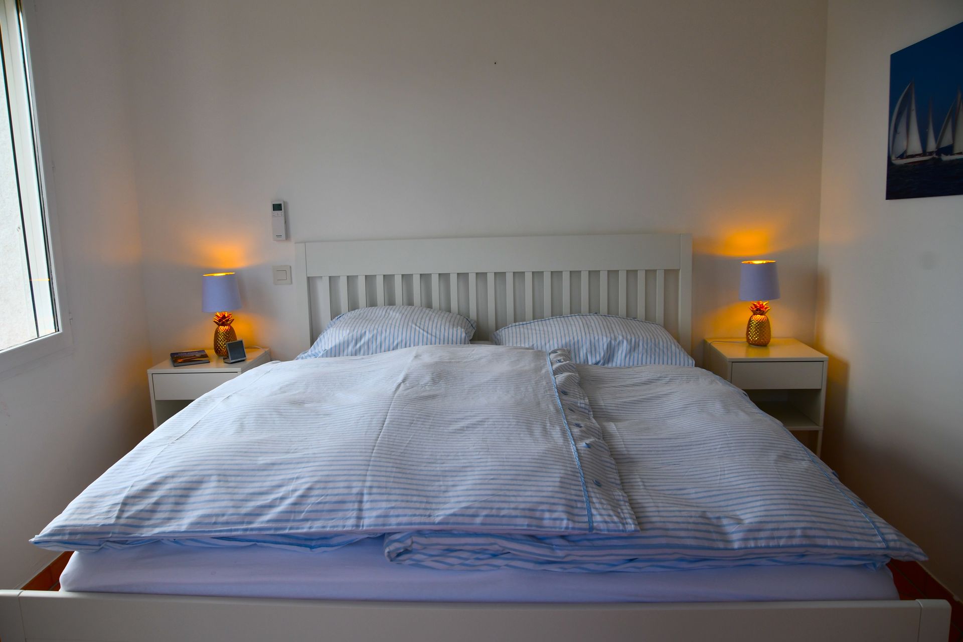 Next to the living room you will find the fully equipped kitchen, which has everything you need to prepare delicious meals, including an electric hob, fridge, freezer, dishwasher, oven and microwave. You can also access the covered terrace from here. A hallway leads to a separate toilet and then to the first bedroom, furnished with a comfortable double bed and a bathroom with a luxurious bath, double washbasin and toilet.